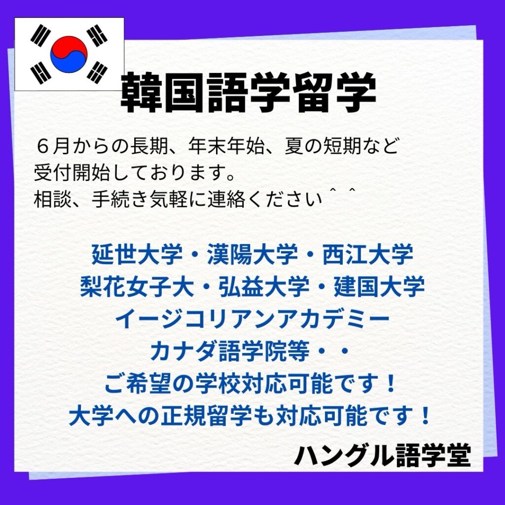 2026年1月26日 / 最終更新日 : 2026年1月26日 ハングル 語学堂 お知らせ 韓国留学🇰🇷 アンニョンハセヨ。ハングル語学堂です。 GWの短期、3か月~韓国留学受付開始しております。留学を考えている方はぜひご相談ください^^大学への正規留学も対応可能になります。 FacebookXCopy