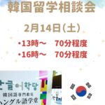 2026年2月7日 / 最終更新日 : 2026年2月7日 ハングル 語学堂 お知らせ 韓国留学相談会 アンニョンハセヨ。 ハングル語学堂です。 対面での留学相談会を行います。 留学を考えている、なんなく聞いてみたい、具体的な話も聞きたいなどどんな相談でも大丈夫なので気軽にご参加ください。 参加希望の方はDM,HPからメー […]